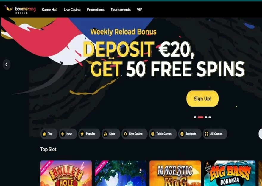 We have great news for you! Boomerang Casino online casino has prepared a really impressive load ofcasino bonusesfor its players . Right from the edge, there is a Welcome Bonus for players, which offers 100% of the first deposit up to €500 + 200 FS. The bonus will be credited the moment you make your first deposit at Boomerang Casino online casino, so this is a deposit bonus.